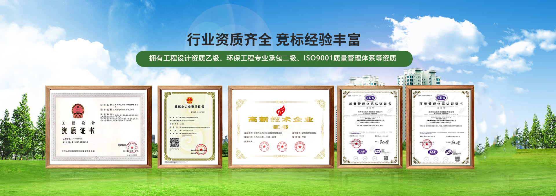• 具備環保工程專業承包二級資質、建筑機電安裝工程專業承包三級、工程設計資質(大氣/固廢乙級)等資質齊全
